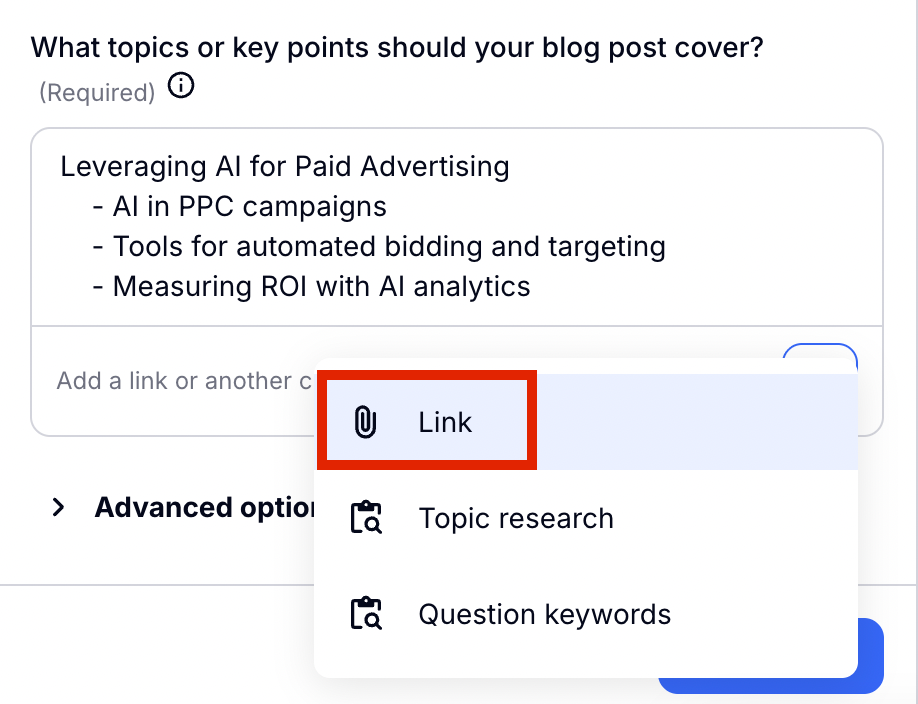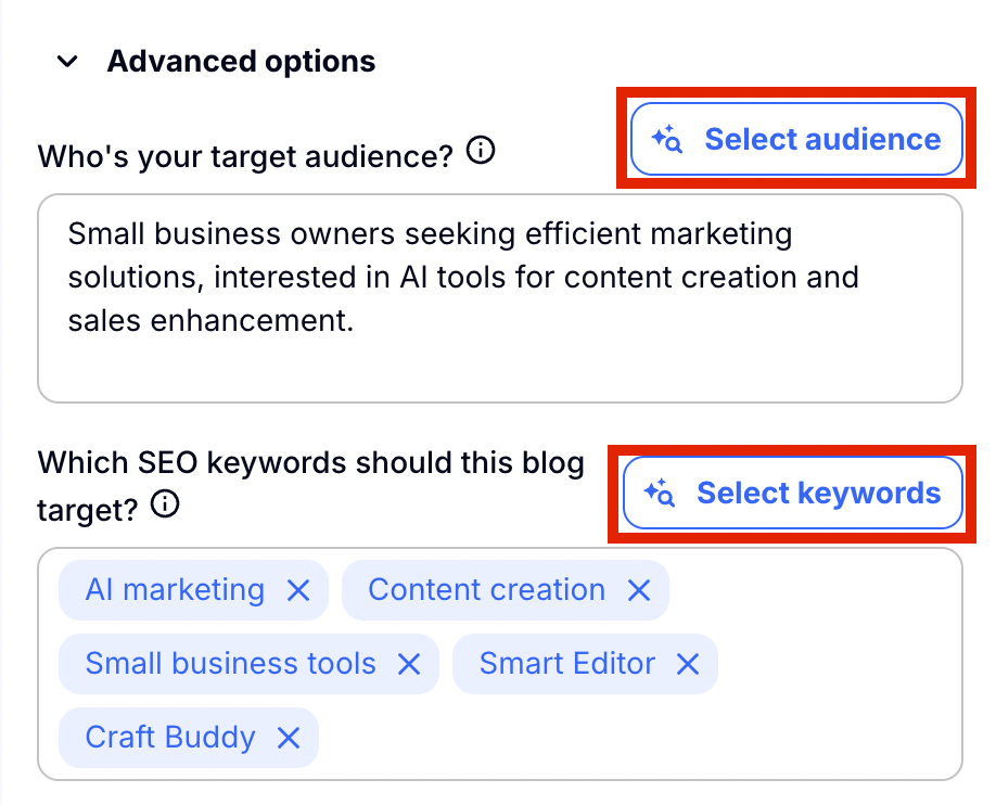 Here you will see advanced configuration settings that you can utilise to personalize your blog even further. Automatically the target audience and SEO keywords from the context you chose at the beginning of the blog will be found here. If you want to add or change these, you can simply write into the box, or choose 'Select audience' or 'Select keywords.'