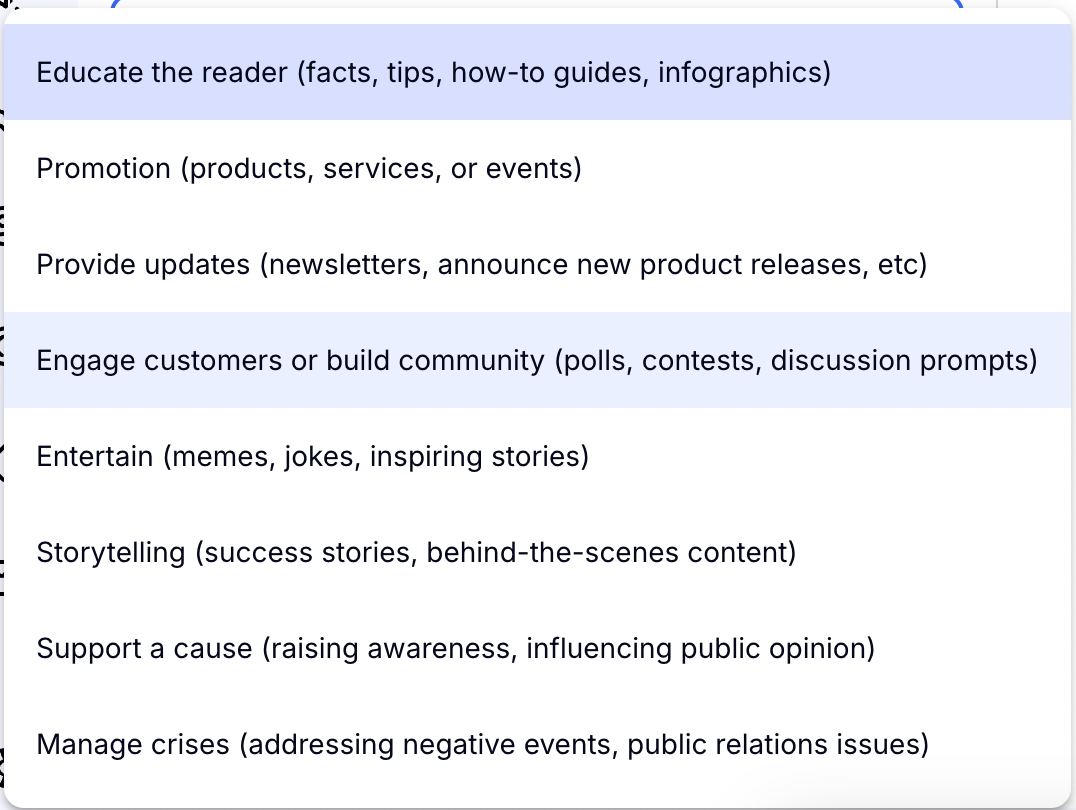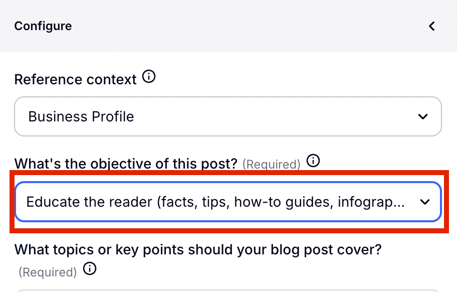 Next you will choose what type of Blog post you want to write. Do you want to promote a new product or do you want to educate your audience on a new topic? Click and choose the right one for you from the drop-down menu.