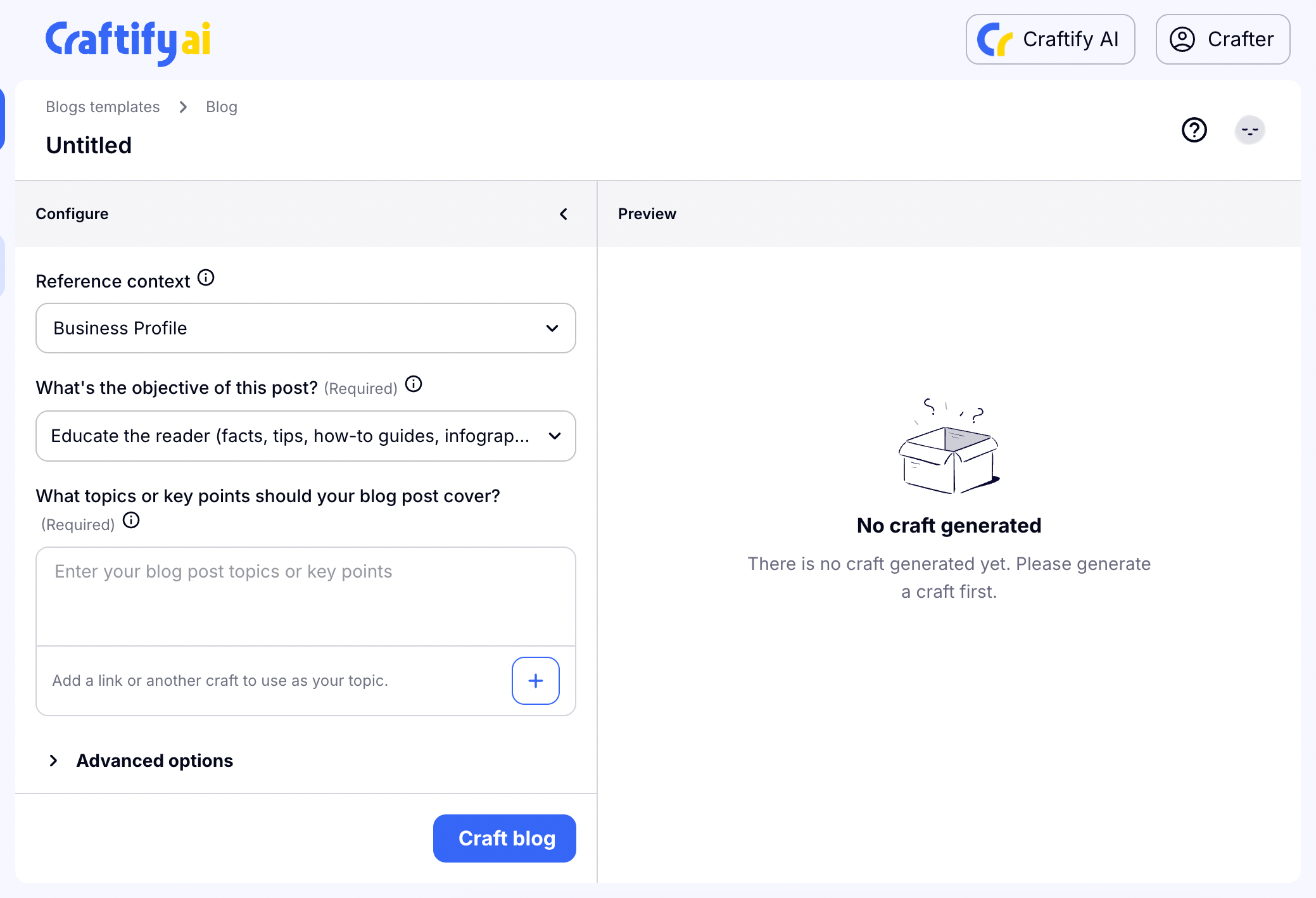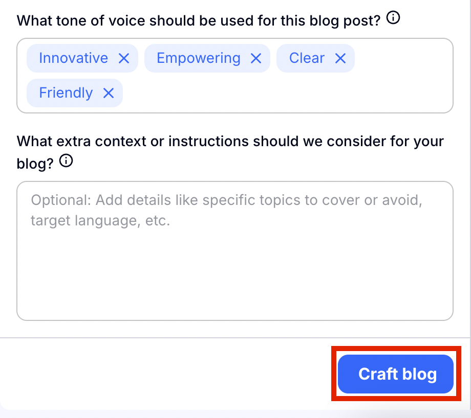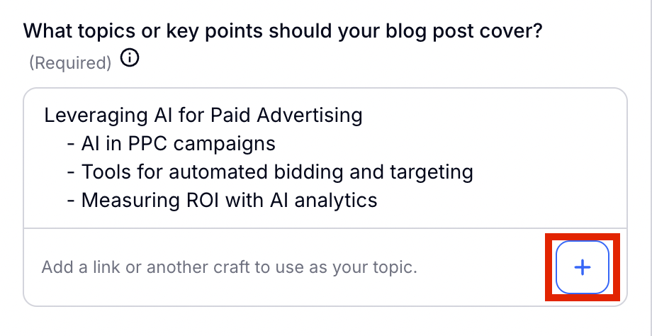 Then you will tell Craftify AI what you want to talk about in your blog! In this space you can give as much or as little detail as you want. AI will do the rest of the thinking for you.