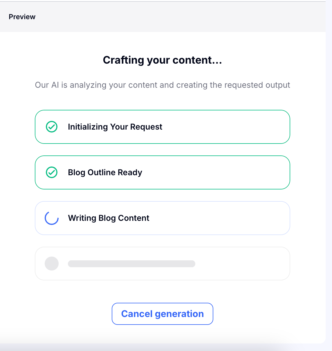 Choose 'Craft blog' to allow Craftify AI to work its magic. On the Preview side of the page you will see the progress of the blog creation. If at any time you want to make a change to the configuration or not continue with the craft, you can choose 'Cancel generation.'