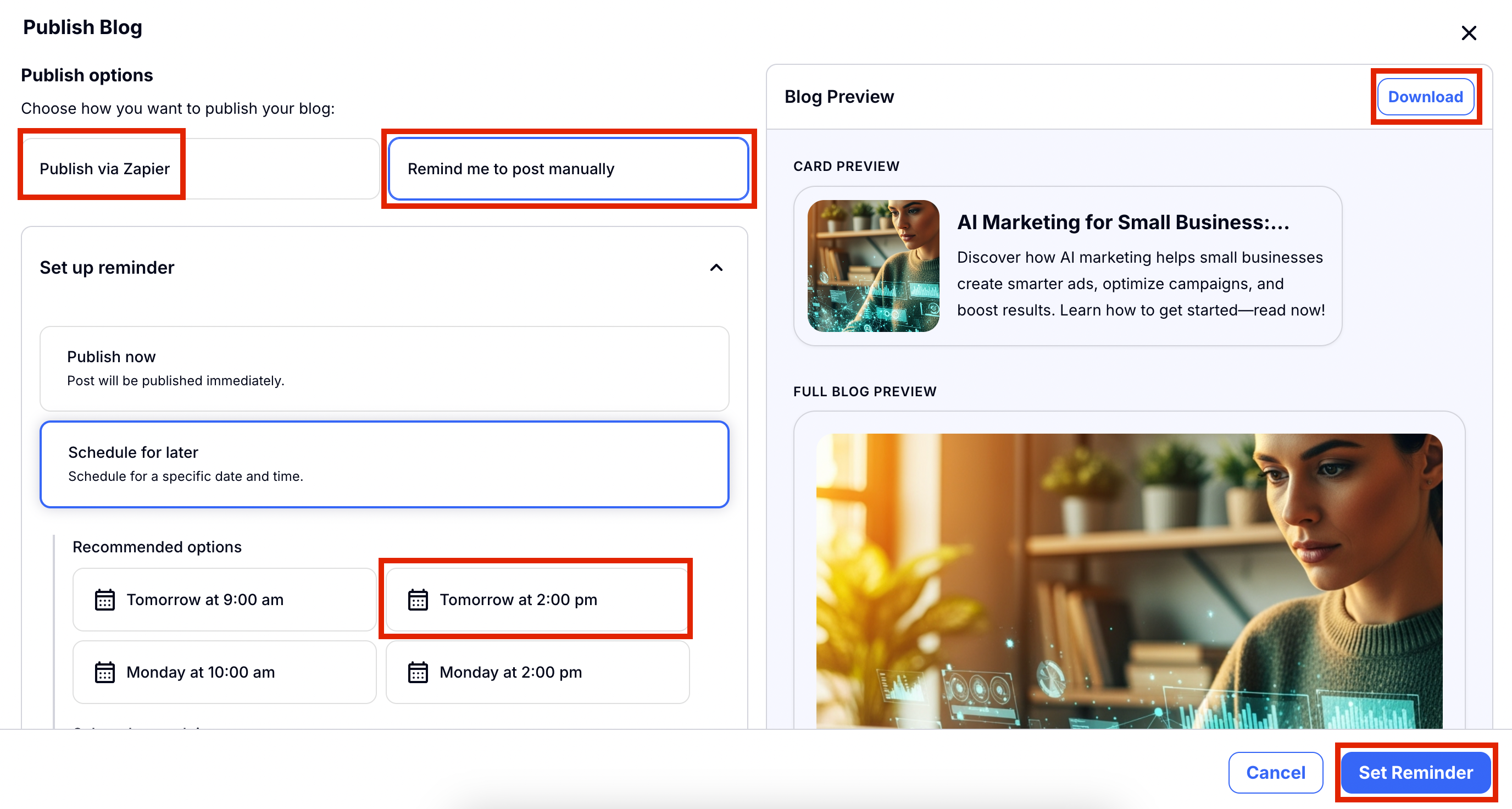 - You can set a reminder to publish at a later date.