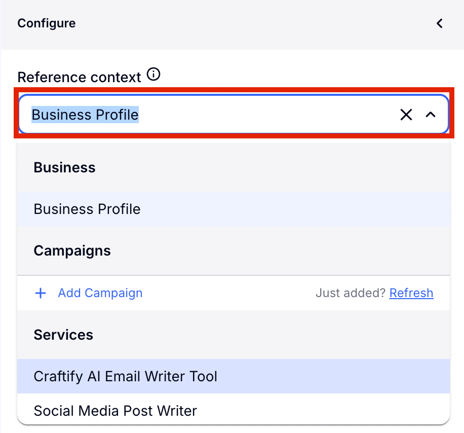 First, you will choose which context you would like to use for your craft. Simply click where it says 'Business Profile' and a drop down menu will appear with all of your campaigns, services, and products. Doing this gives Craftify AI the background context to use that information for you post!