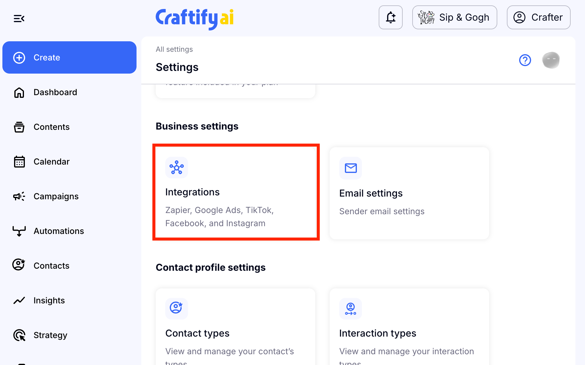 Then scroll down to Business Settings and choose 'Integrations.'