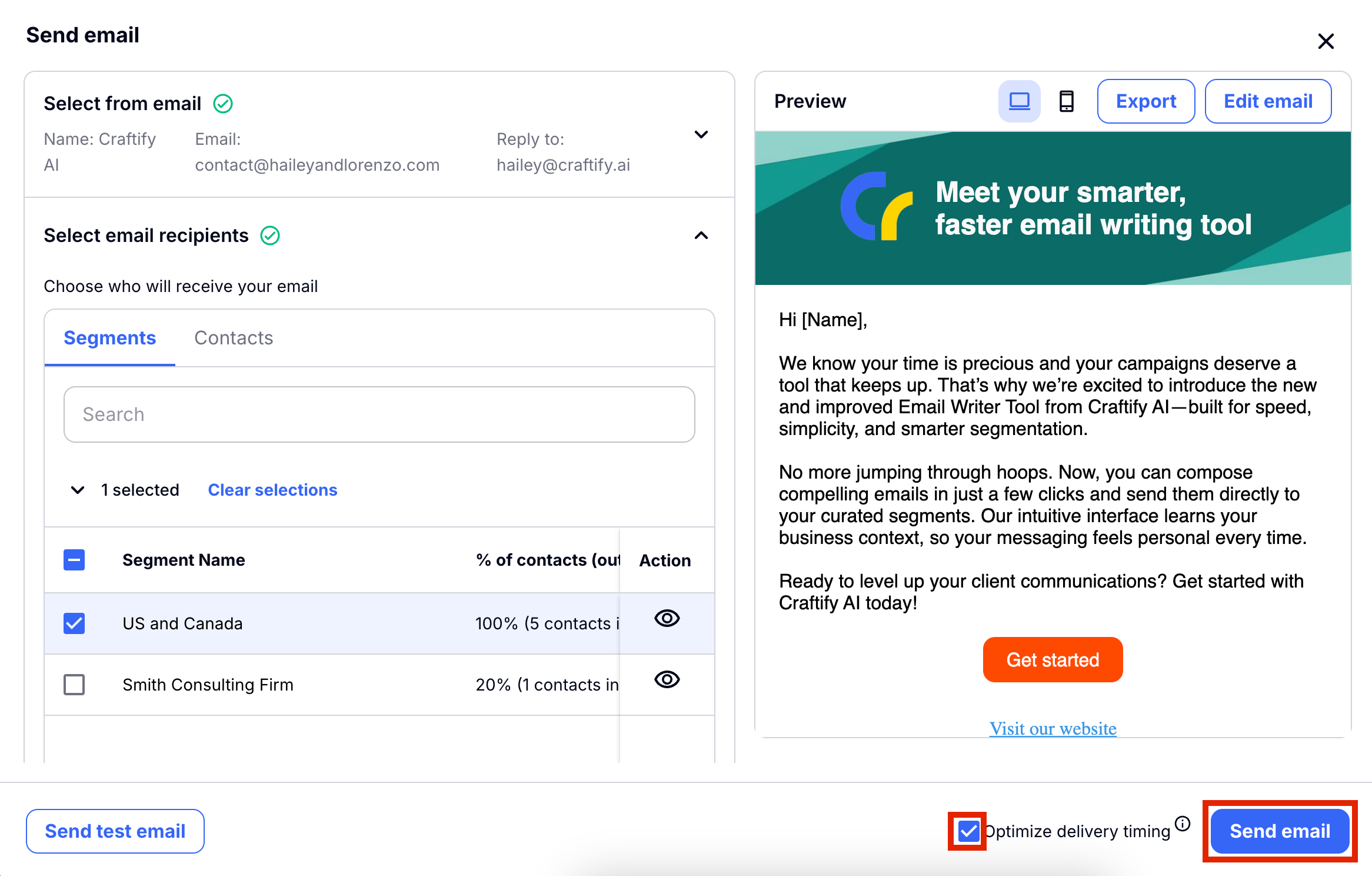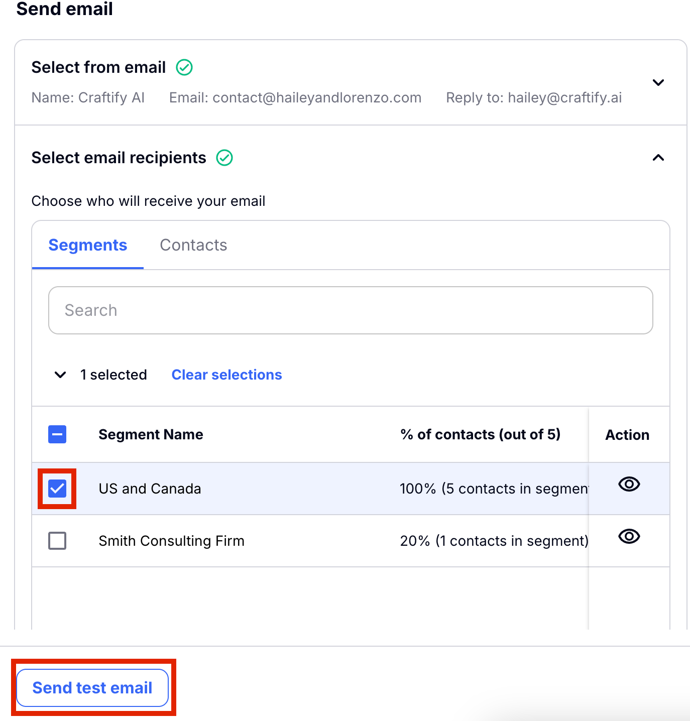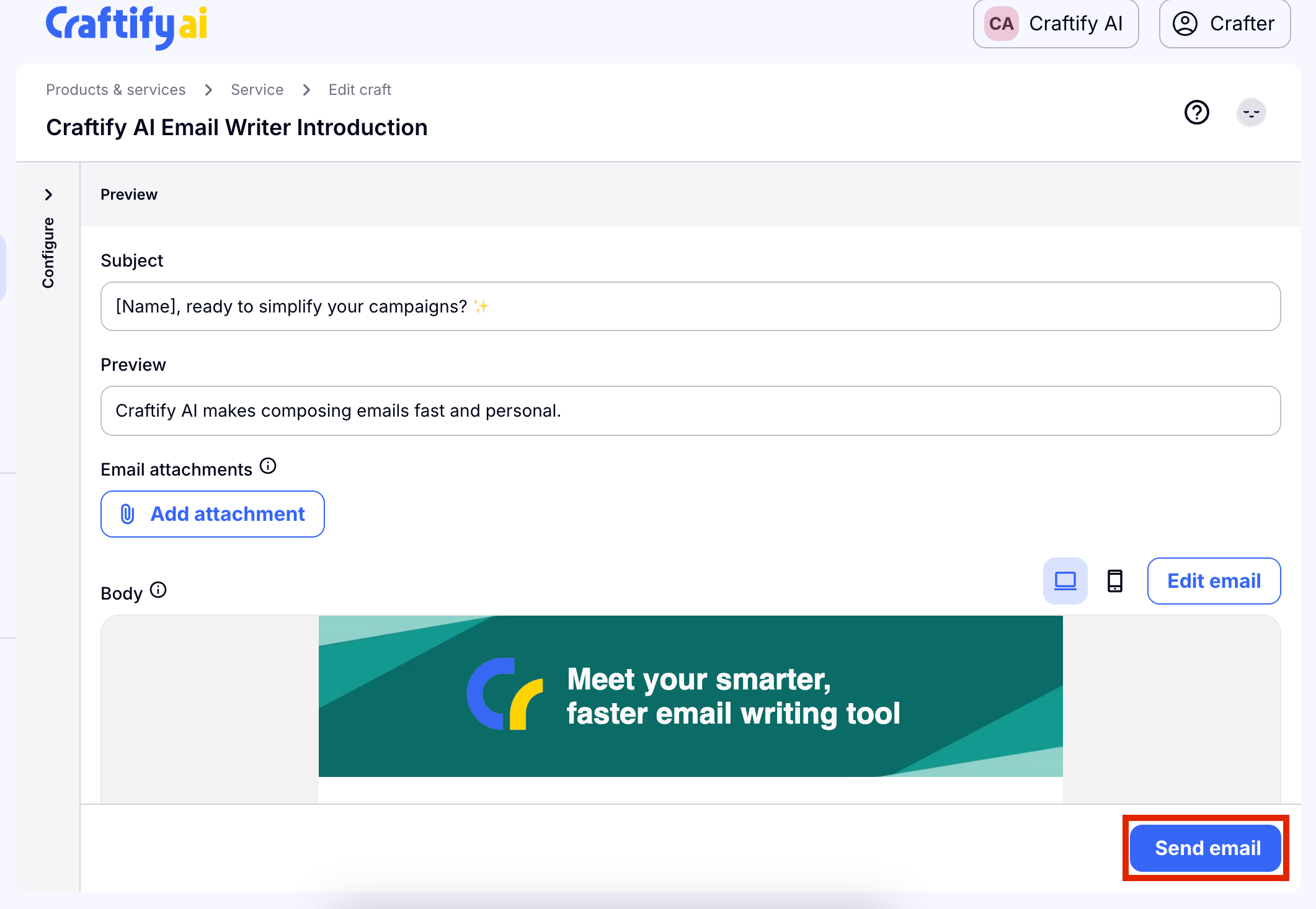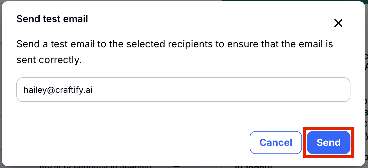 Simply enter your email address in the input box. Automatically you should find the email you used to register with Craftify AI. Send the test email and then check it in your preferred email source to make sure it looks great.