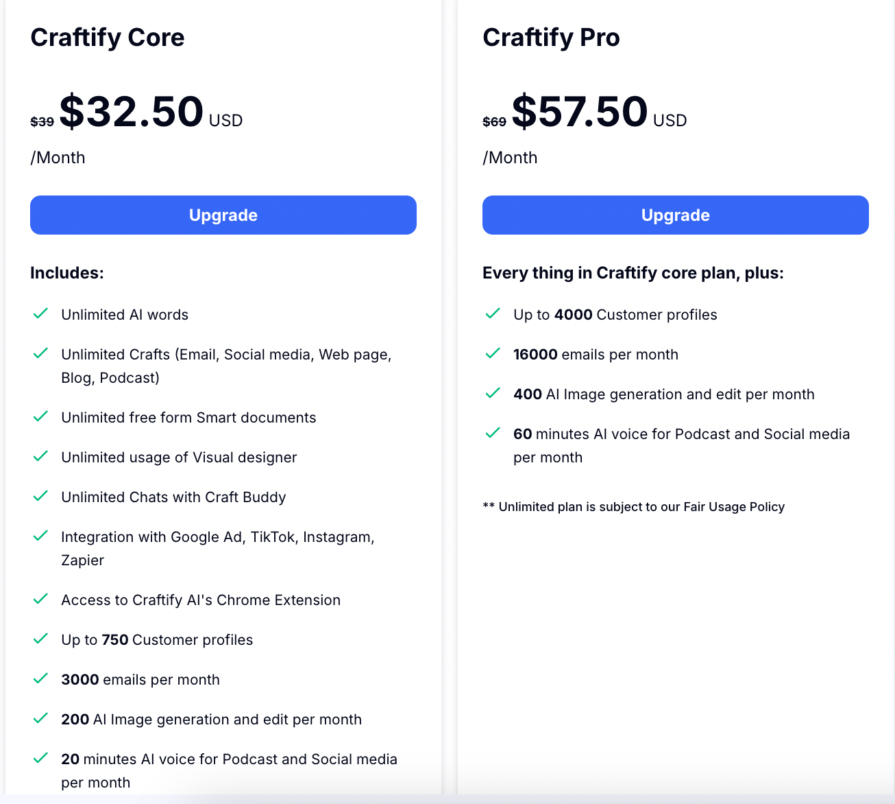 For bigger companies or those of you who want to generate more images and voice and send more emails, then Craftify Pro is for you. It has everything that Craftify Core has but the limits are much higher. So you can send more emails with ease!