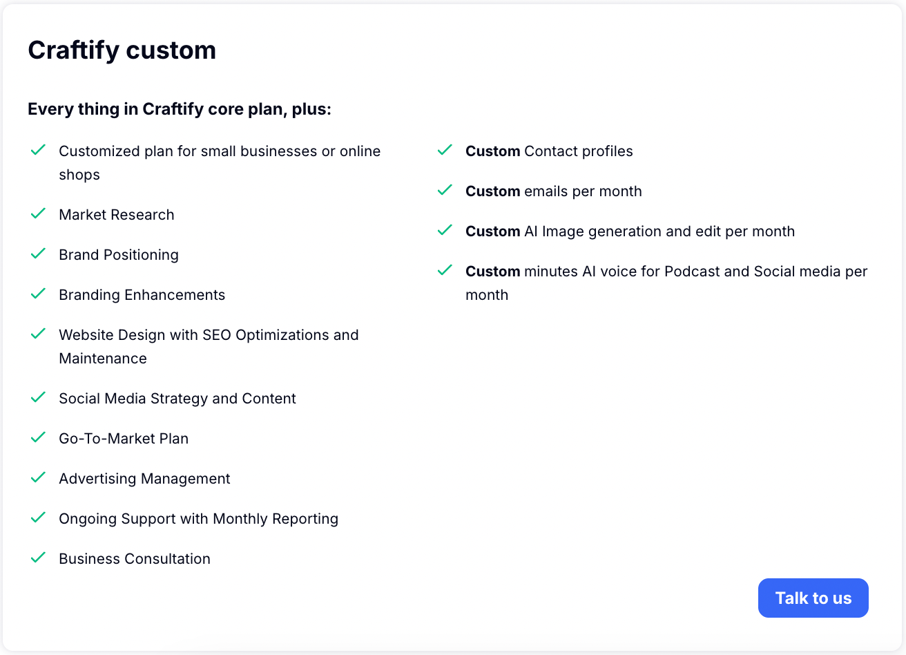 Don't see what you want? We can custom build your Craftify AI Subscription plan for your business. Just choose Talk to us to get started!