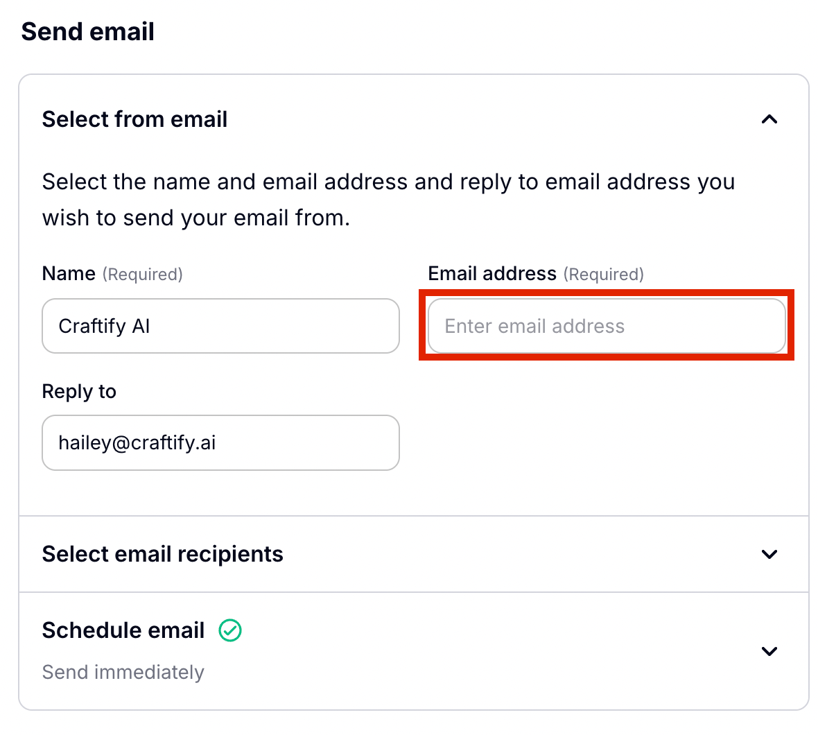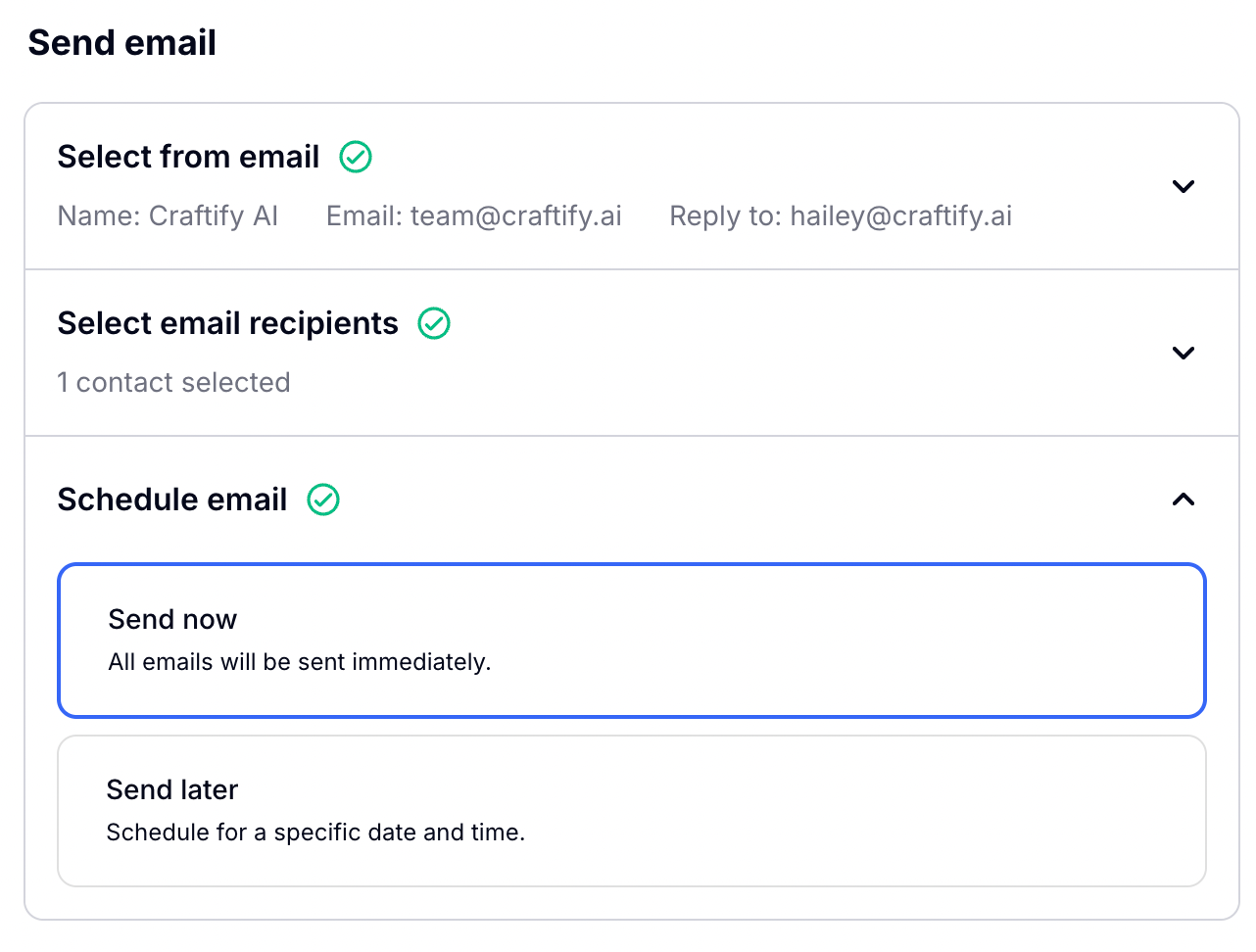 By choosing to schedule you will see here all of the details to imput for when you want your email sent out. You will be able to track this scheduling in the Content Calendar section of Craftify AI after you set this up.