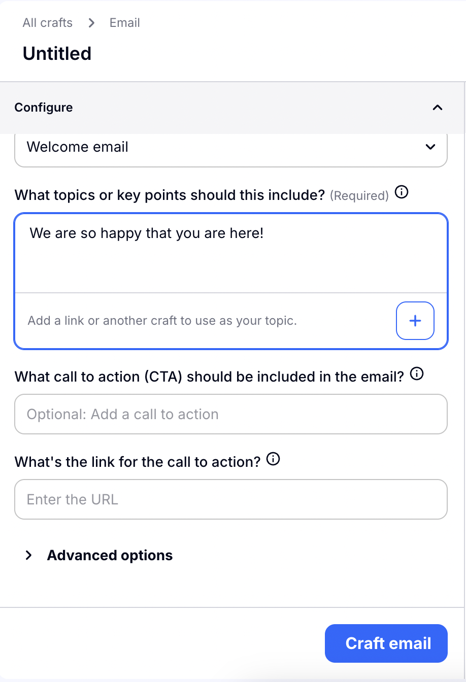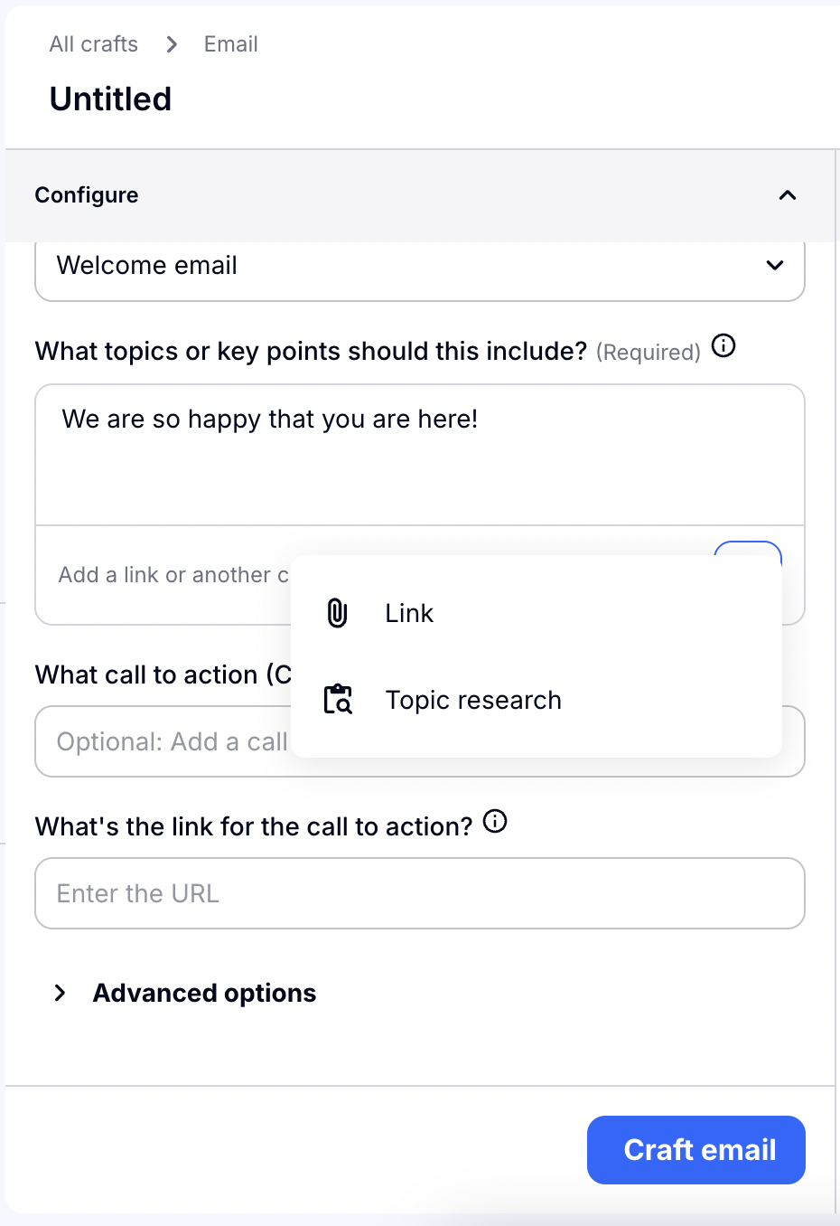 You will then give the specific information necessary to write the email. Tell Craftify AI a little about what this email should be about. If you're short on words and want to bring in some exterior inspiration, you can click the plus sign and add a link! Craftify AI will read this link and include relevant information in your email.