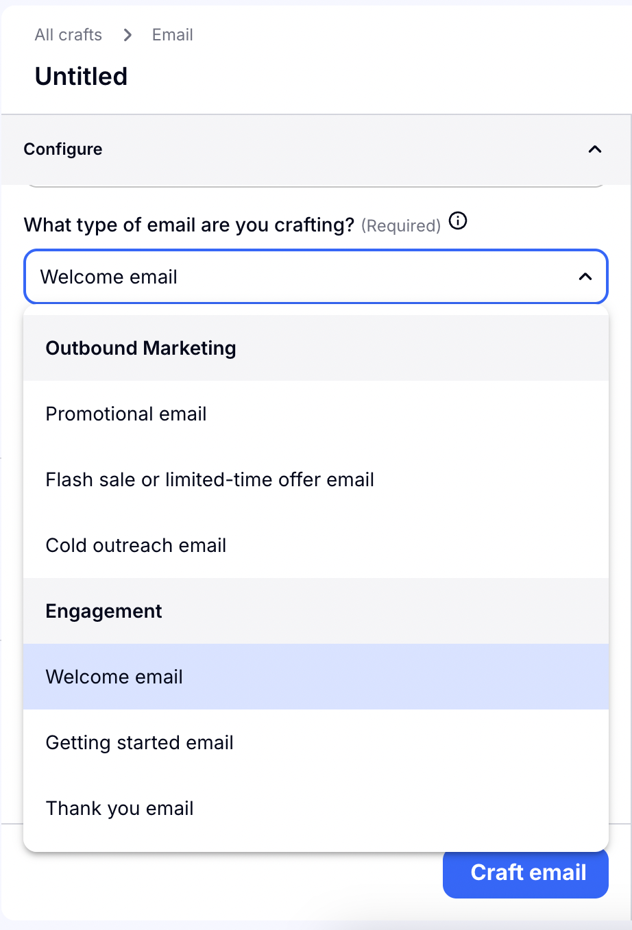 You will then be asked to imput which type of email this is. Craftify AI has an extensive list of options for this, so just click the button and choose which one works best for your craft.