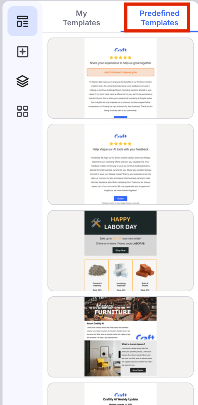 On the left-hand side you will find templates. If you haven't already created any templates for your email, that's fine, choose the right tab here for Predefined Templates, and you can choose from some of our pre-made templates for your email.