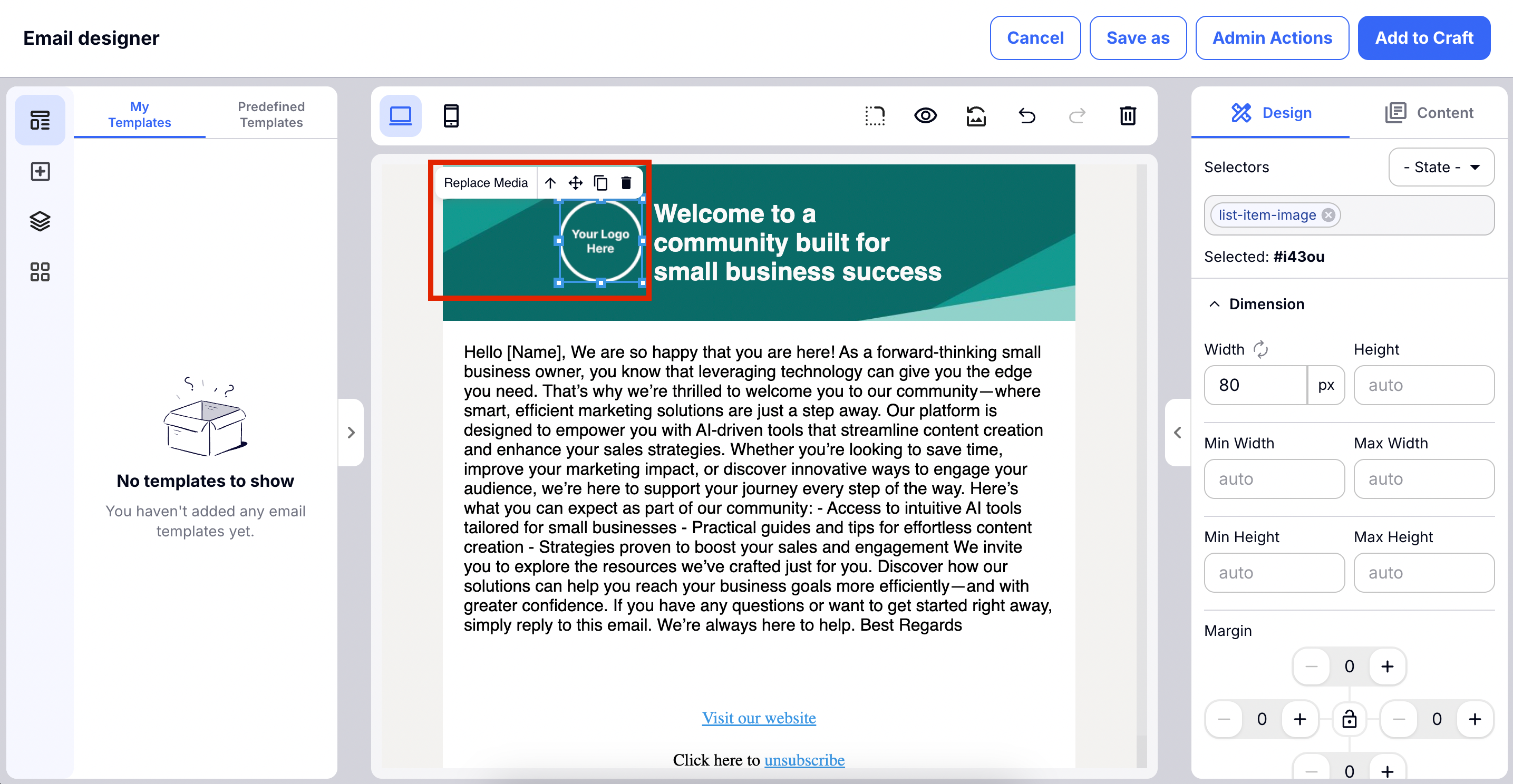 If you don't already have your logo added to Craftify AI, you can add it in place of the logo in the design. If you do already have your logo uploaded to your business profile, then if should automatically show up in the email's design header.