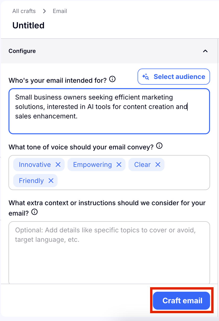 You can choose your audience that this email is for! Maybe you have created an audience before, you can choose one of those by choosing the Select Audience button, or you can write in one yourself. Automatically the main audience that is associated with your Business Profile will be found here.