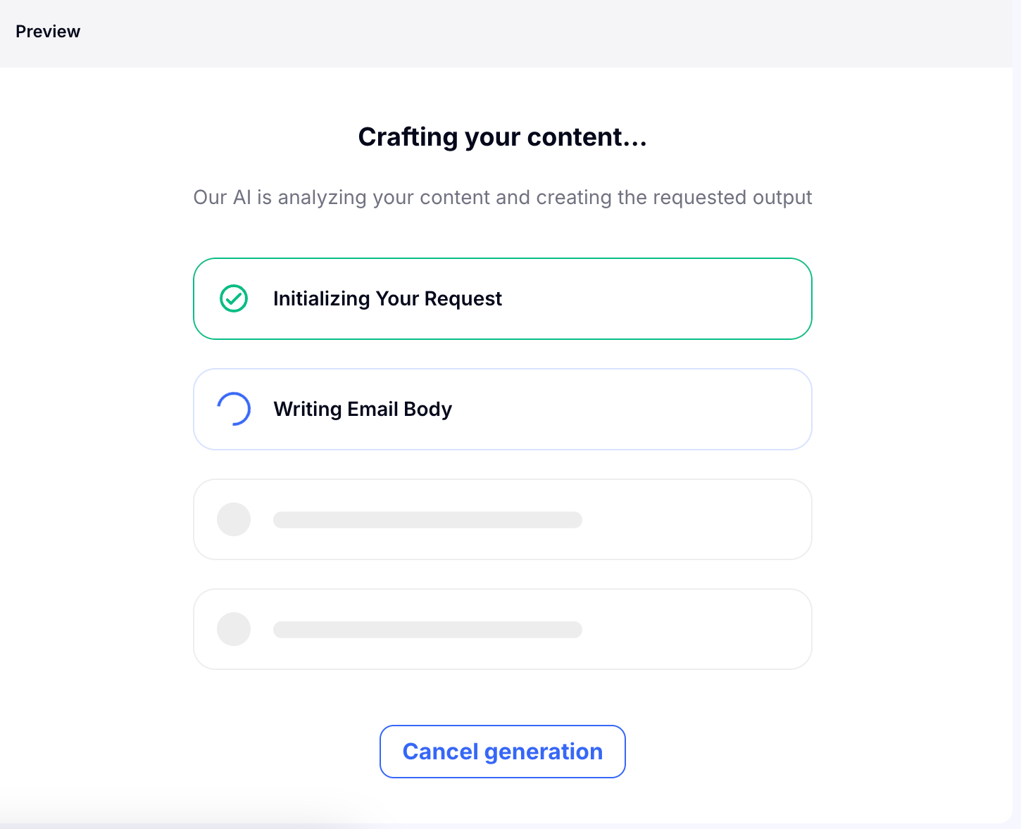 Once you've added all of the details, choose Craft Email and you'll see this pop up on the right hand side as Craftify AI works to craft your email. This should only take a few seconds. If you wish to change something in your settings, then you can choose Cancel Generation.